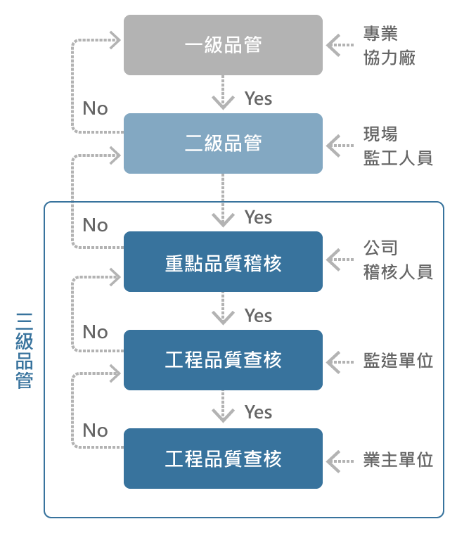 為確保施工品質,維護建築物結構安全及裝修品質,從物料進場的檢驗到施工前、中、後的查核,制定一套完整的三級品管制度,讓專業協力廠商到工務所工程人員到公司品稽單位各司其職,形成一條完整的品管鏈,確保工程如期如質完成。